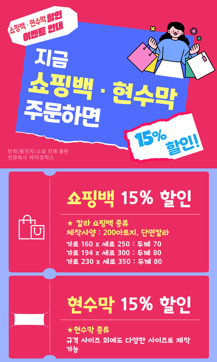 Ä®¶ó ¼îÇιé 15% ÇÒÀÎÇà»ç(8¿ù~10¿ù) 1) ¼îÇιé (°¡·Î160, ¼¼·Î250, µÎ²² 70) ´Ü°¡Ç¥ https://icomics.co.kr/bbs/board.php?bo_table=su081&wr_id=694&list_style=list 2) ¼îÇιé (°¡·Î194, ¼¼·Î300, µÎ²² 80) ´Ü°¡Ç¥ https://icomics.co.kr/bbs/board.php?bo_table=su081&wr_id=695&list_style=list 3) ¼îÇιé (°¡·Î230, ¼¼·Î350, µÎ²² 80) ´Ü°¡Ç¥ https://icomics.co.kr/bbs/board.php?bo_table=su081&wr_id=696&list_style=list